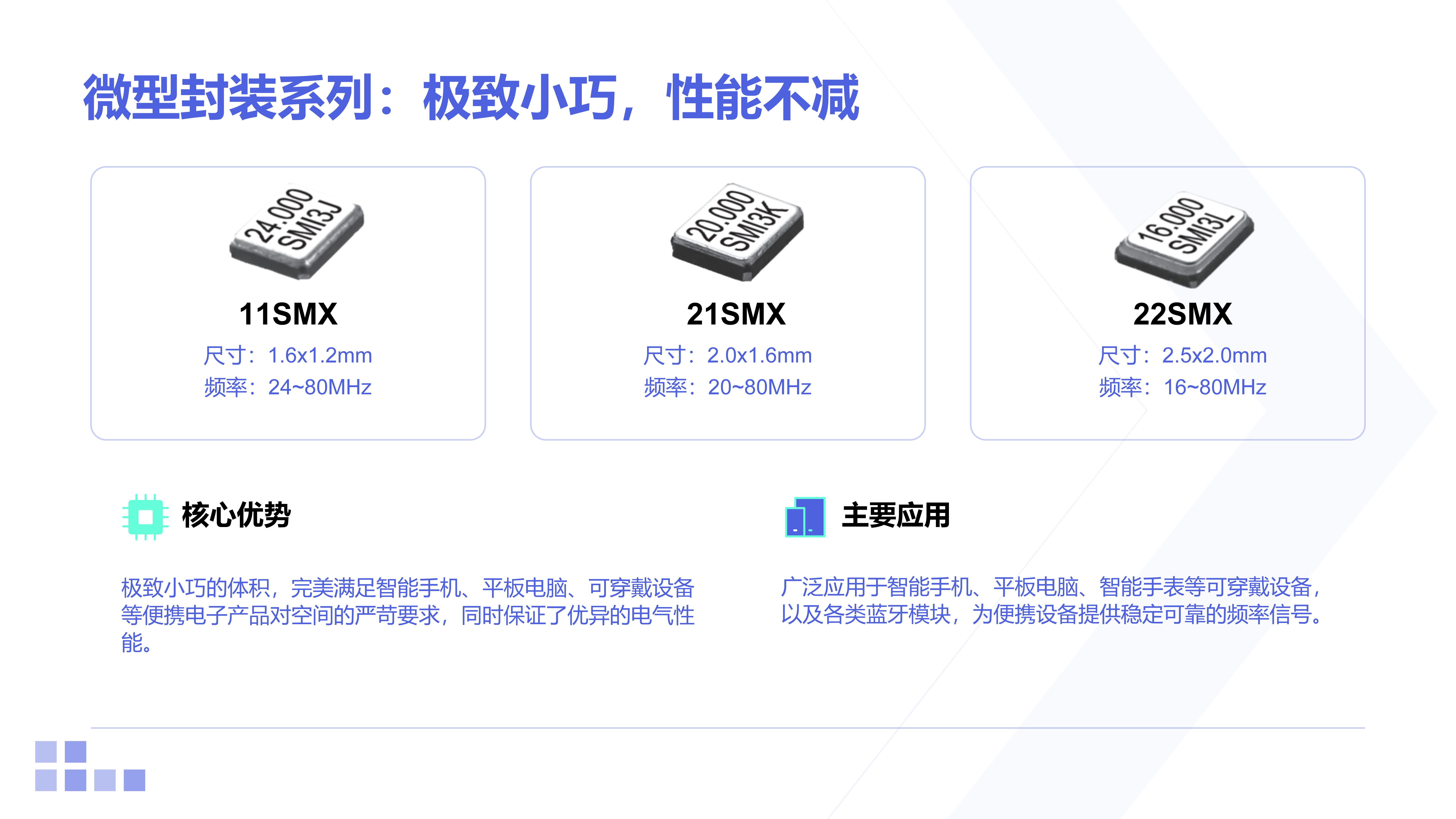 | SXO-2016V |  | 1.6x2.0x0.7 | CLIPPED SINE | 13~52 | ±2 | +1.8~+3.3 | -30~+85℃(Standard) -40~+85℃(Option) | ±9~±13ppm (1/2 VDD ±0.8V or ±1V) |