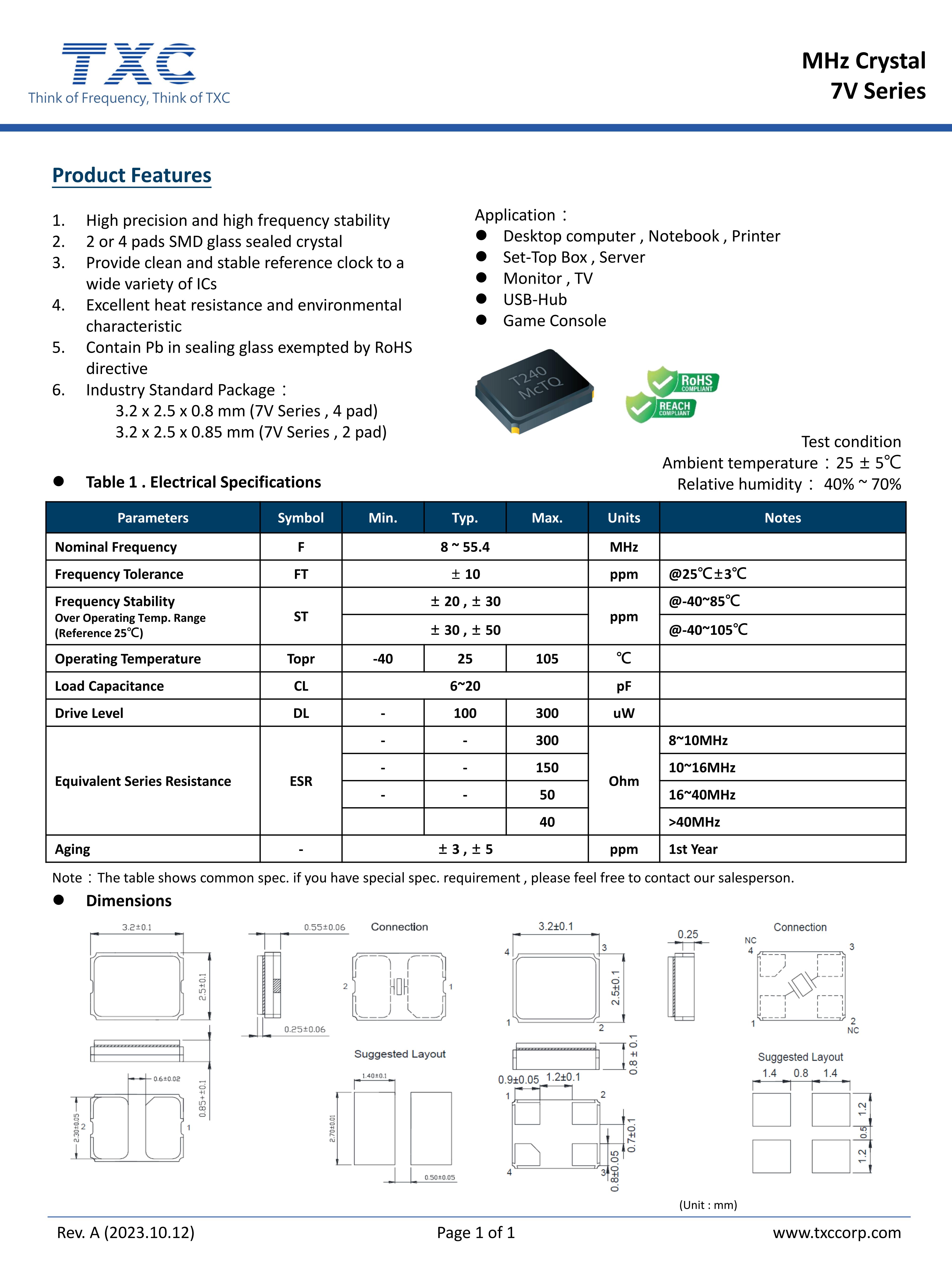 晶振作为频率控制的核心元件,其重要性不言而喻,台湾TXC晶振公司作为全球晶振行业的最大厂商,凭借其卓越的技术实力和丰富的产品线,赢得了全球电子产业的广泛认可,今天加科电子特别推荐一款TXC晶振公司旗下的明星产品7V无源晶振这款专为消费类电子产品设计的晶振正以其出色的性能引领着电子产品的精准时代,7V无源晶振提供8MHz至55.4MHz的宽频输出范围满足不同应用场景的频率需求,其频率容差低至±20 x 10-6(25℃±3℃)确保了输出频率的精准度无论是数字电子还是消费产品这款晶振都能以其出色的稳定性为设备提供可靠的频率基准。