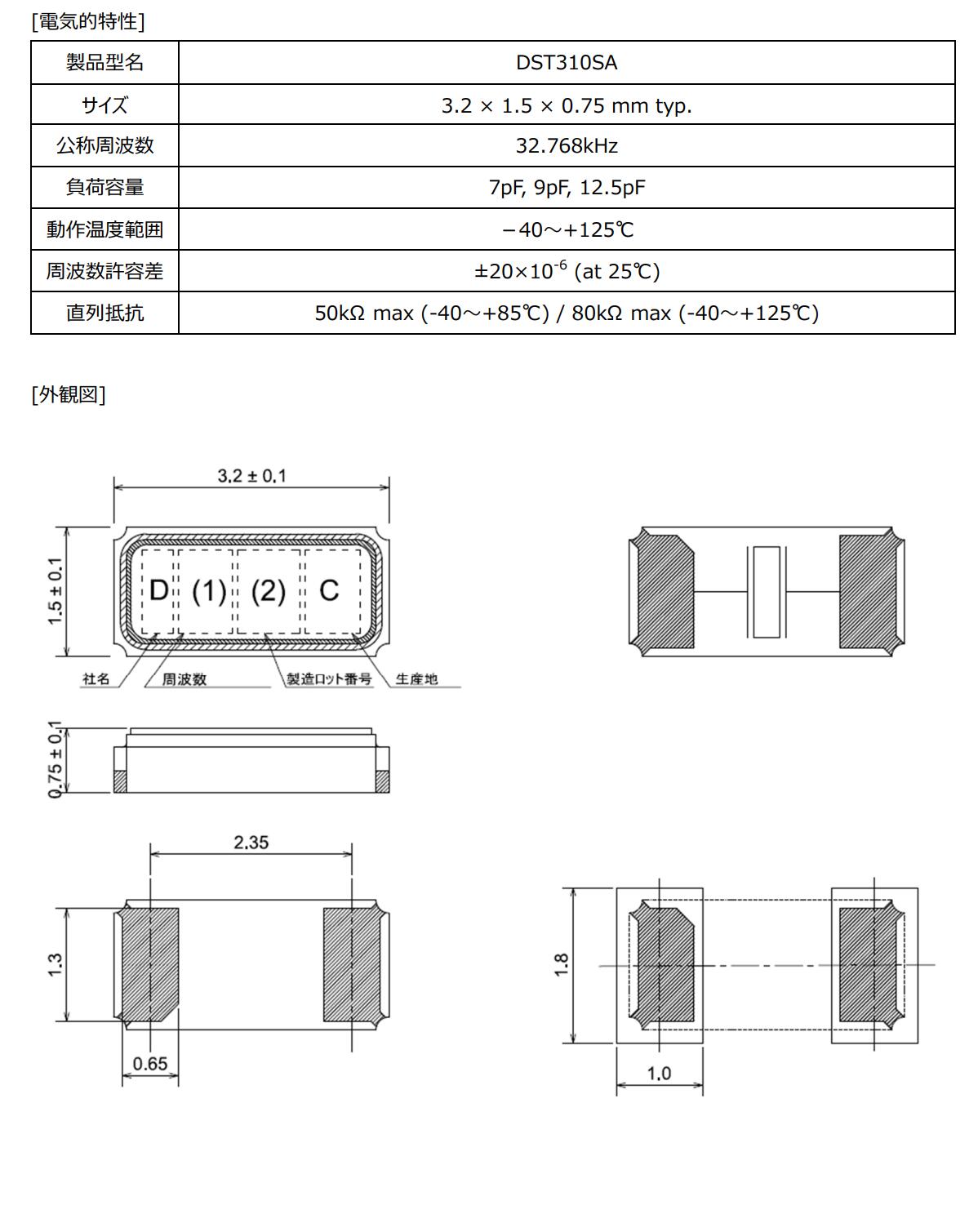 在科技飞速发展的当下,电子设备对核心元件的性能要求愈发严苛,尤其是在冲击和振动频繁的环境中,稳定可靠的元件成为保障设备正常运行的关键,日本大真空KDS晶振公司敏锐捕捉市场需求,精心推出了一款具有卓越耐冲击性能的音叉型贴片晶振DST310SA其凭借出色的特性在众多领域展现出巨大潜力,DST310SA晶振频率为32.768KHz,负载电容7pF,9pF,12.5pF,容差±20×10-6 (at 25℃) ,电阻50kΩmax (-40〜+85℃) / 80kΩmax (-40〜+125℃) 此外拥有小巧精致的3.2x1.5x0.75mm尺寸这一设计堪称精妙在车载电子设备日益紧凑化的趋势下,如此小巧的体积使其能够轻松融入各种复杂的电路布局中不占用过多空间为车载设备的小型化设计提供了有力支持。