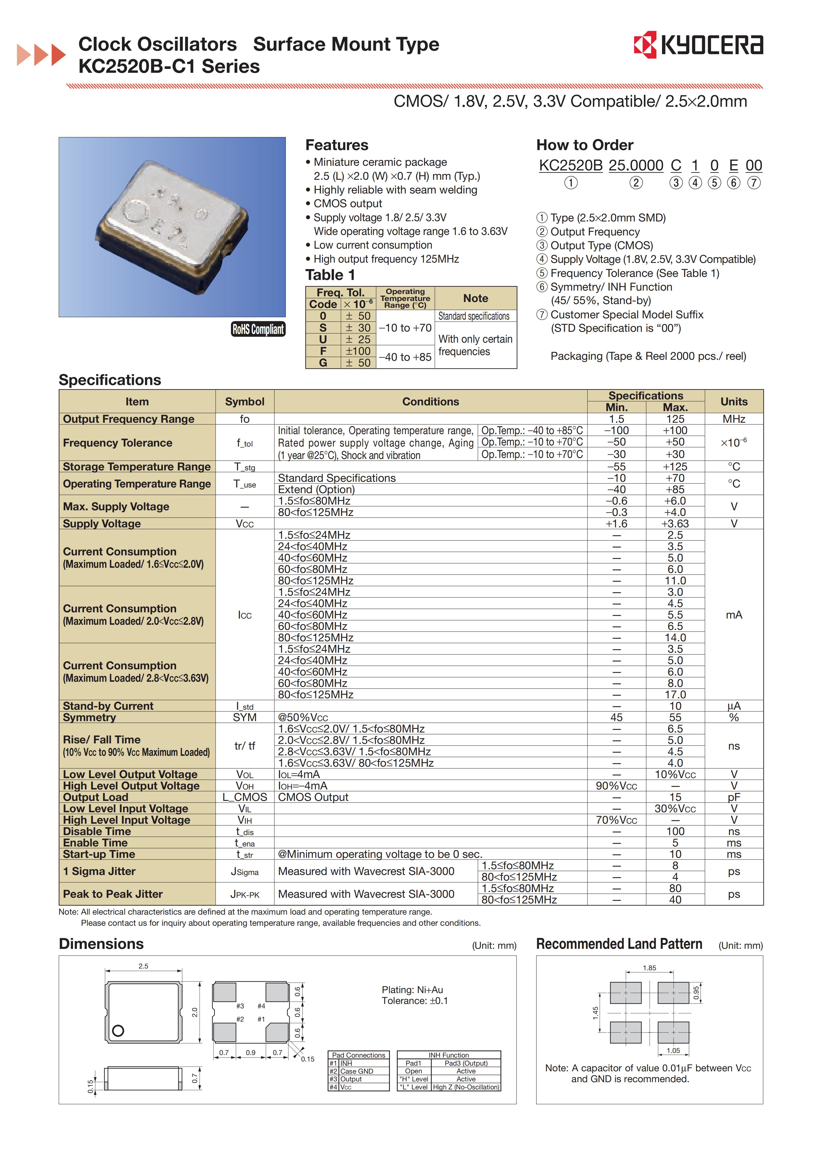KC2520Z25.0000C1JY00 | 25MHz | -40°C ~ 85°C | ±25ppm | 1.8V 2.5V 3.3V | KC2520Z | 加科电子 |