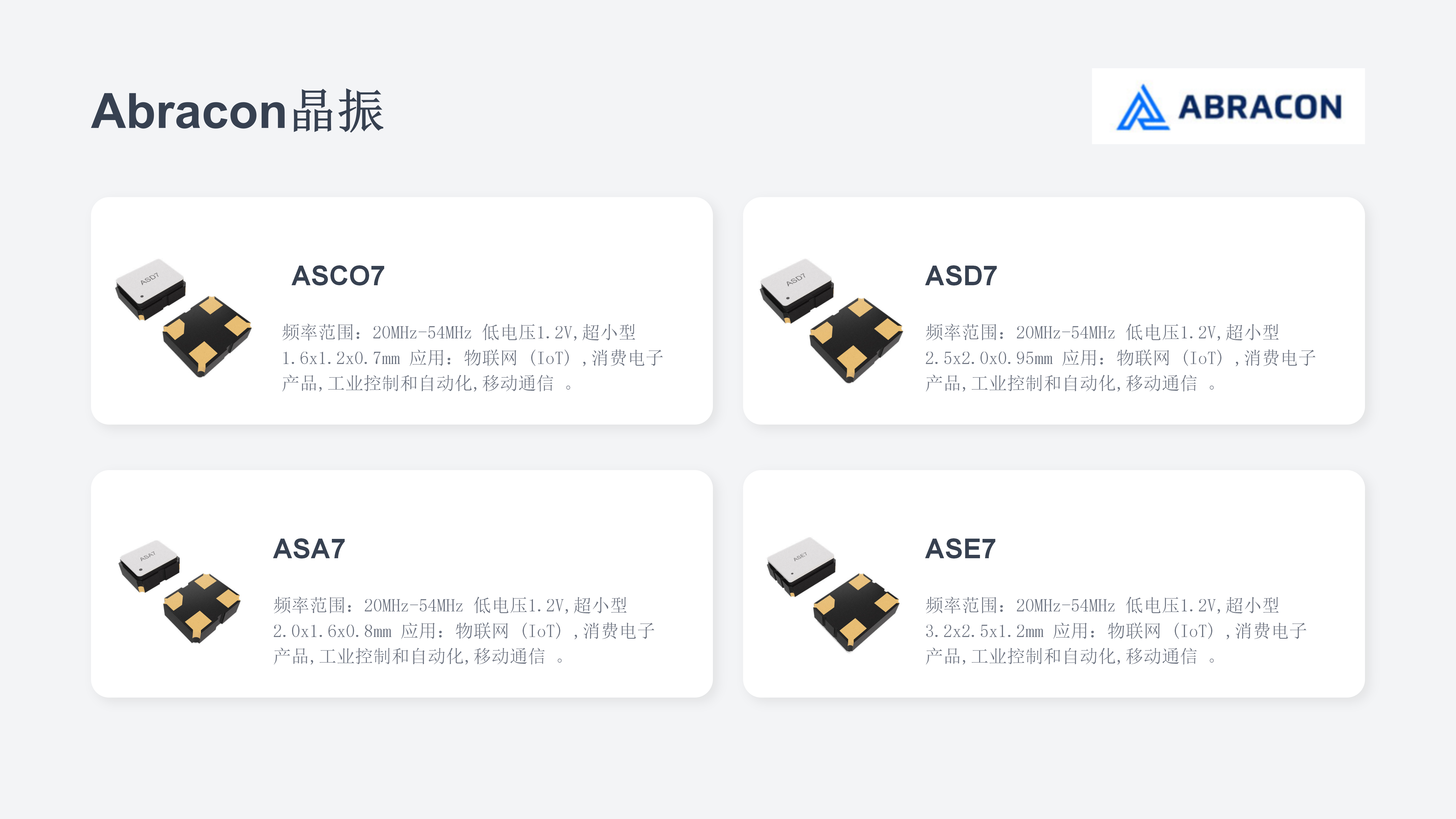 为满足不同PCB空间约束与设计复杂度要求该系列精心规划了ASCO7,ASA7,ASE7,ASD7四款衍生型号,它们全面适配包含行业标准小尺寸规格在内的多种主流封装尺寸实现了从极端紧凑的可穿戴模组到相对宽松的工业IoT节点的全场景覆盖,所有型号均输出标准的CMOS逻辑电平,确保与当前市场上绝大多数低功耗微控制器(MCU),无线SoC及传感器芯片的I/O引脚电平无缝兼容,开发者无需增加额外的电平转换电路,即可在现有BOM架构下完成低功耗升级,大幅缩短产品研发与验证周期,Abracon晶振公司推出的四款低电压晶振不仅是企业自身技术矩阵的纵深拓展,更是对物联网永久续航终极愿景的一次硬核回应,当极低功耗不再是瓶颈而是标配,海量节点设备的长周期免维护部署将成为现实。