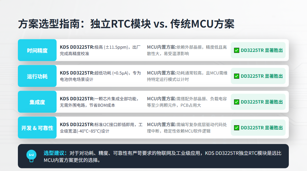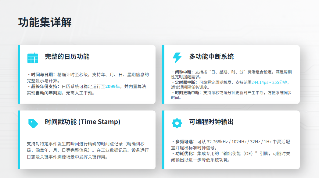 DD3225TR实时时钟模采用3.2×2.5x1.0mm小型SMD封装,契合当下设备轻薄化,高密度集成趋势,节省PCB布板空间,适配智能手机,平板,便携仪器,小型工控模块等对尺寸严苛的产品,封装工艺满足无铅环保标准,全面符合RoHS指令,兼容主流回流焊工艺,支持自动化批量生产,降低制造门槛,助力企业提升生产效率,控制成本,凭借高精度,低功耗,宽适配,全功能的综合优势,DD3225TR实时时钟模可广泛覆盖消费电子,工业控制,数据记录仪,无线传感器,娱乐设备,智能计量,安防监控,医疗终端,车载电子等众多领域,在智能电表中DD3225TR实时时钟模提供精准峰谷计时,保障计费公平,在工业数据记录仪里,稳定时间戳确保生产数据可追溯,在无线传感器终端中,低耗特性延长电池更换周期,在车载与医疗设备中,高可靠性支撑系统安全运行,成为跨领域计时核心器件。