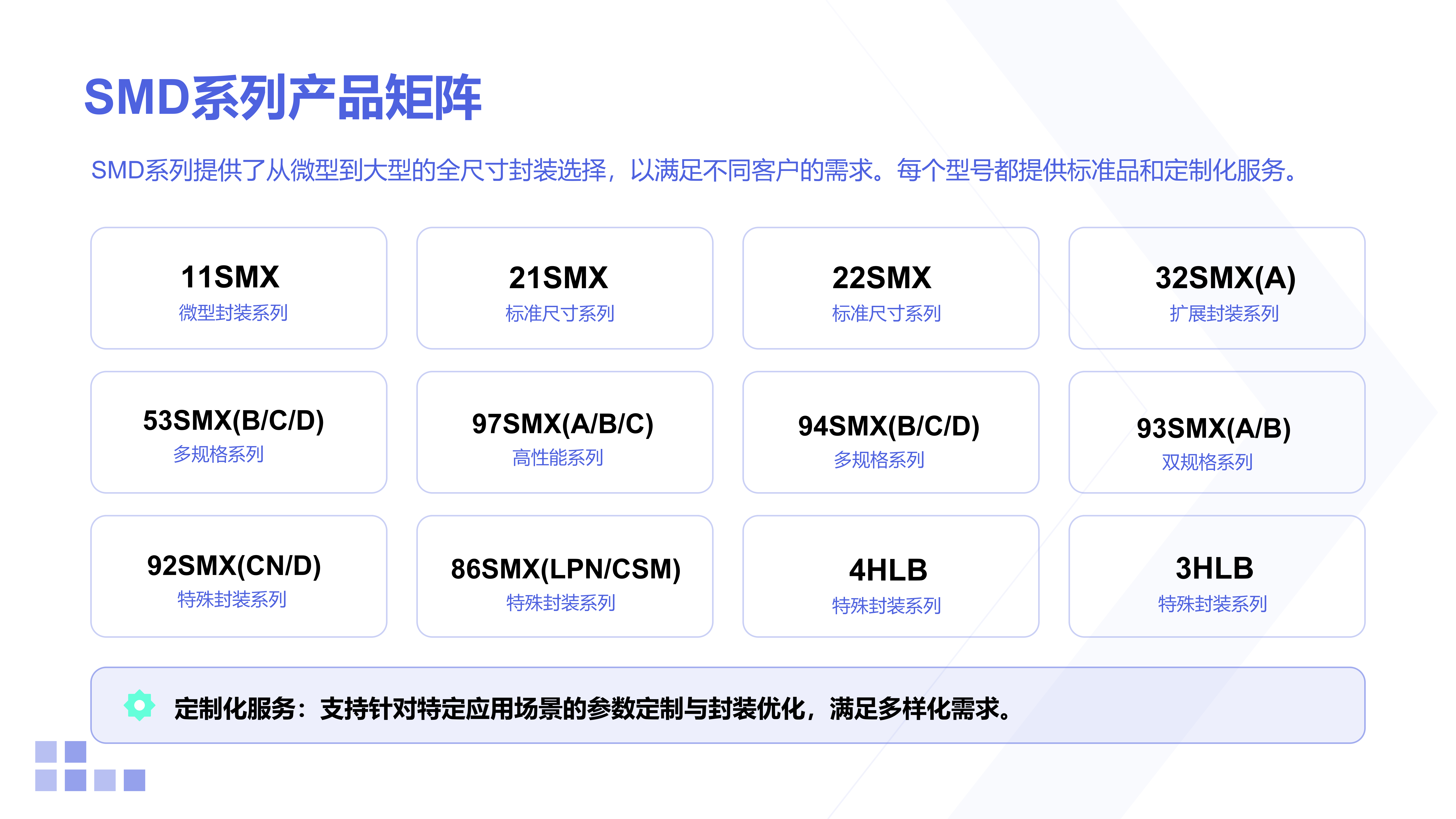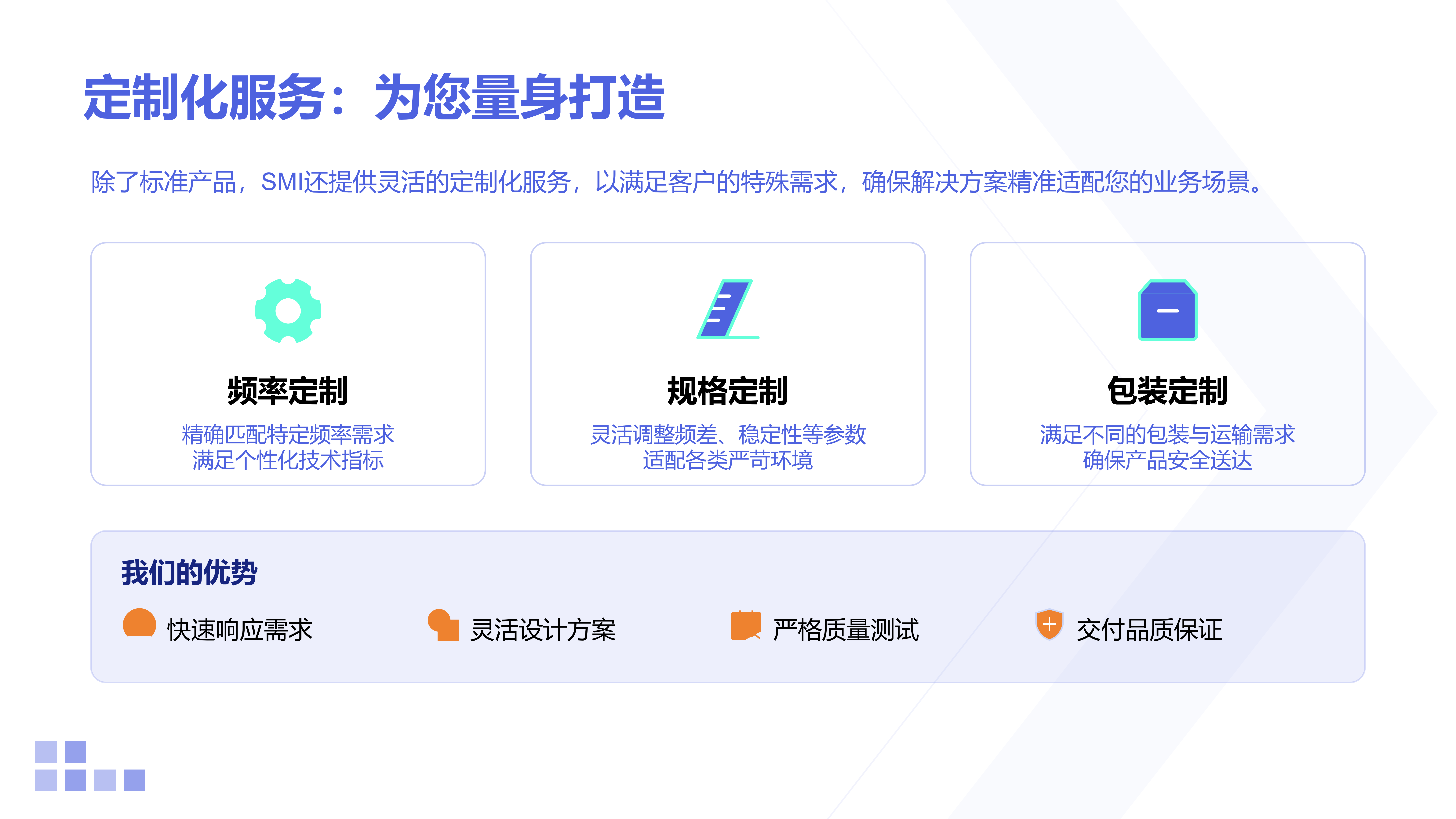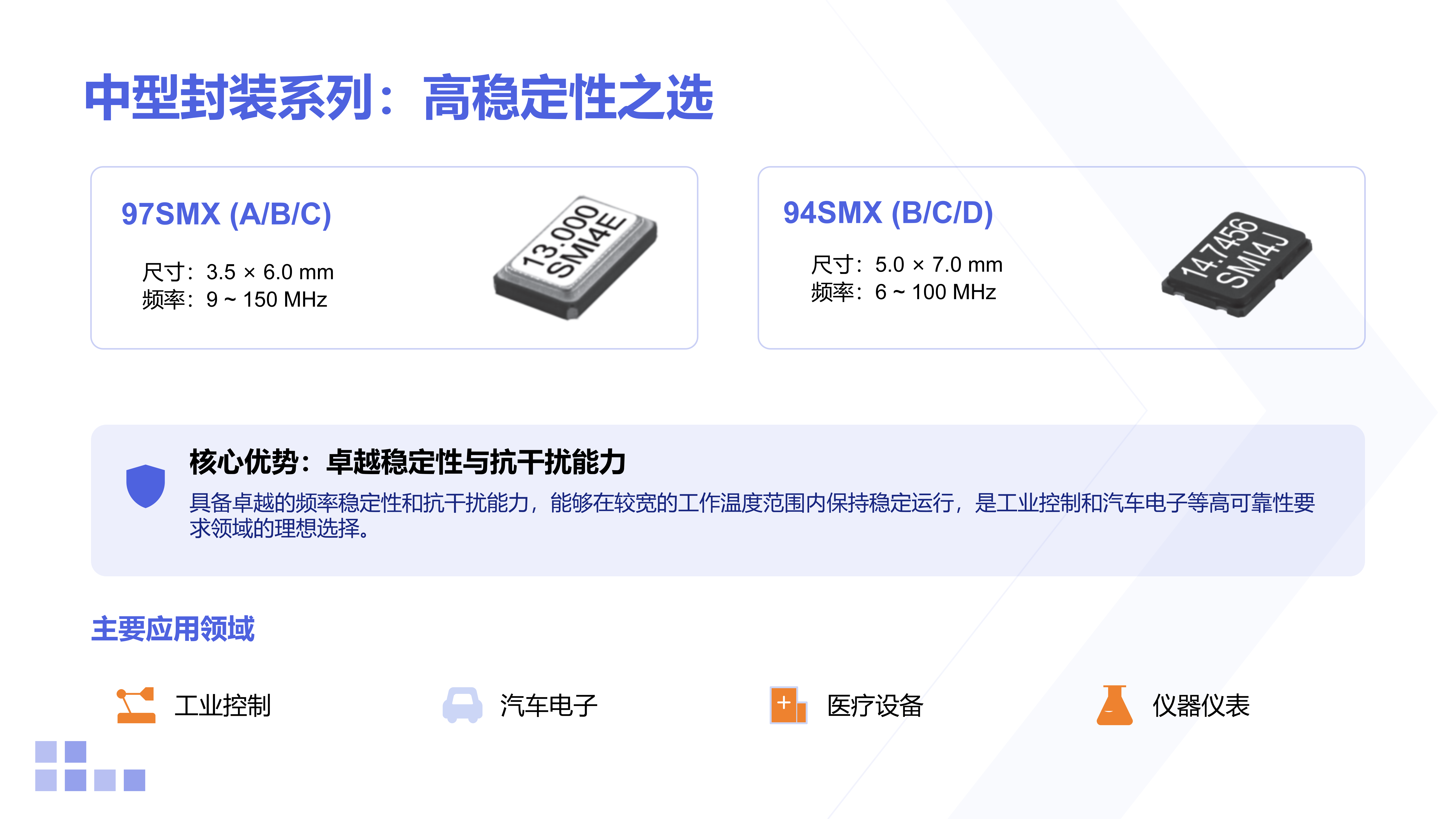 | SXO-4053CMV |  | 3.2x5.0x1.5 | CMOS | 13~52 | ±0.5~±2.5 | +1.8~+3.3 | -30~+75℃(Standard) -30~+85℃(Standard) -40~+85℃(Option) | ±8~±15ppm (1/2 VDD ±0.8V or ±1V) |