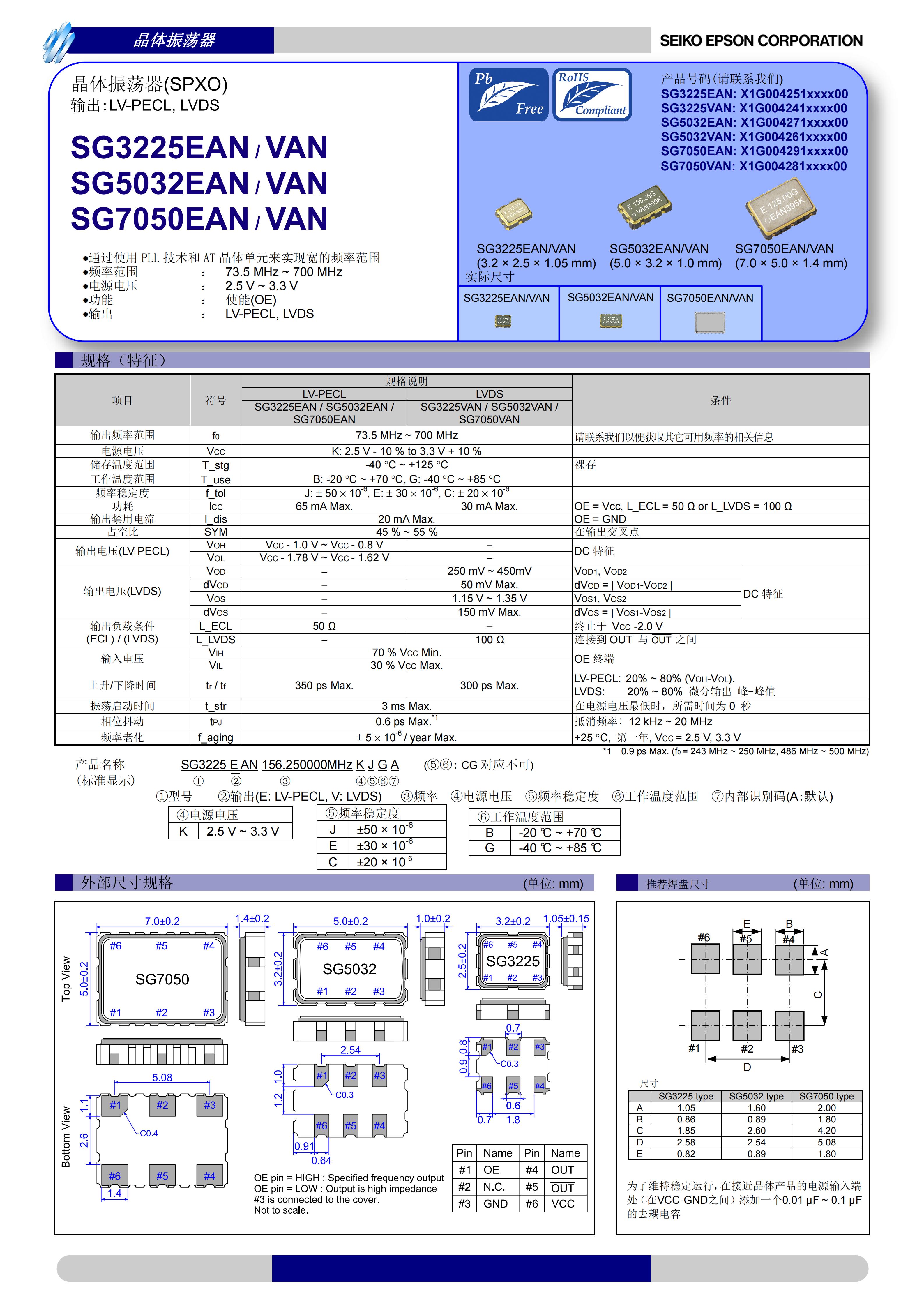 日本EPSON爱普生SG5032EAN与SG5032VAN差分晶振的LVDS,LVPECL输出,±20ppm超低温漂,十年老化率仅±5ppm,工作温度范围:B级:-20°C+70°C覆盖常规环境,G级:-40°C+85°C直面极寒极热,存储温度更达-40°C+125°C无惧南北极科考沙漠勘探等极端场景,频率公差:J级±50ppm,E级±30ppm,C级±20ppm,精准分级满足不同需求其中C级精度媲美温度补偿晶振(TCXO),却无需复杂电路设计,SG5032EAN与SG5032VAN差分晶振年老化率:25°C,3.3V条件下首年仅±5ppm十年使用仍能保持频率偏差在极小范围内为长期运行的设备提供可靠保障,SG5032EAN与SG5032VAN差分晶振极速响应3ms启动,0.6ps超低抖动信号传输零延迟,在最小工作电压(Vcc Min.)下≤3ms即可进入稳定振荡状态比传统晶振快3倍以上确保设备开机即用无需漫长等待。