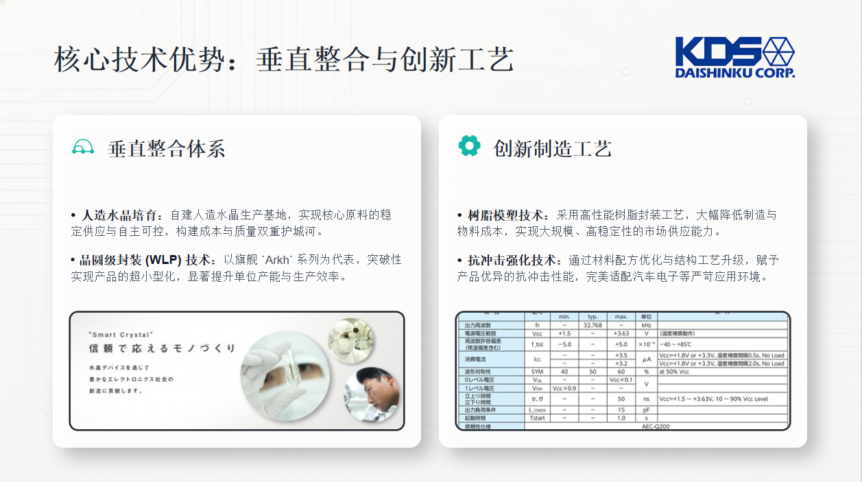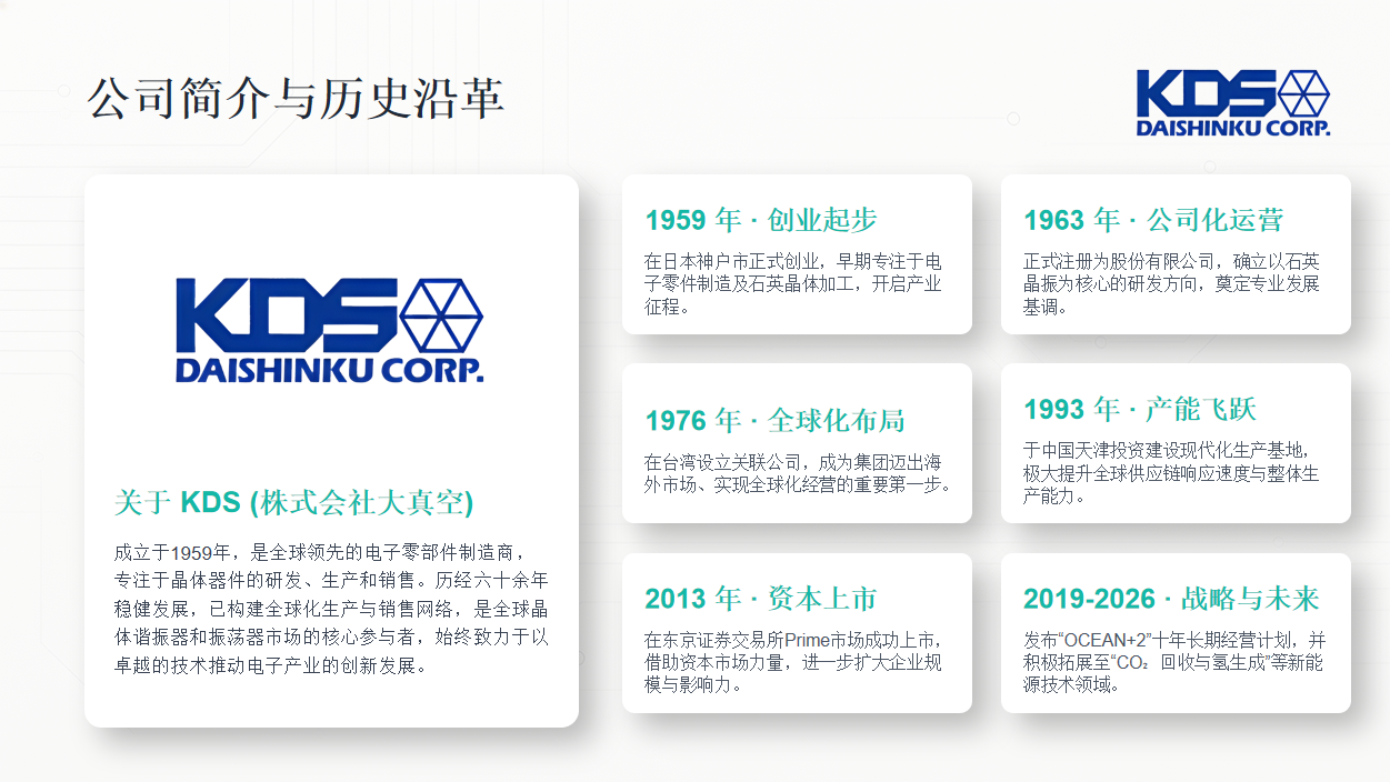 日本KDS晶振公司汇聚全球顶尖研发团队,专注晶振材料,设计,封装,测试等全链条技术突破,从人工水晶培育工艺优化,大幅缩短培育周期,降低能耗,到微型化封装技术革新,实现1008等小尺寸量产,满足设备轻薄化需求,再到MEMS晶振,高稳定差分振荡器等前沿产品研发,同时KDS晶振公司推进制造智能化,搭建高效柔性生产线,实现高精度,大批量稳定交付,兼顾成本优势与品质保障为客户提供高性价比产品,从一颗小小的晶振日本大真空株式会社支撑全球数字社会的时序基准,从日本神户的初创企业,到全球布局的行业巨头KDS大真空始终坚守用每一颗高精度晶振传递值得信赖的品牌承诺。