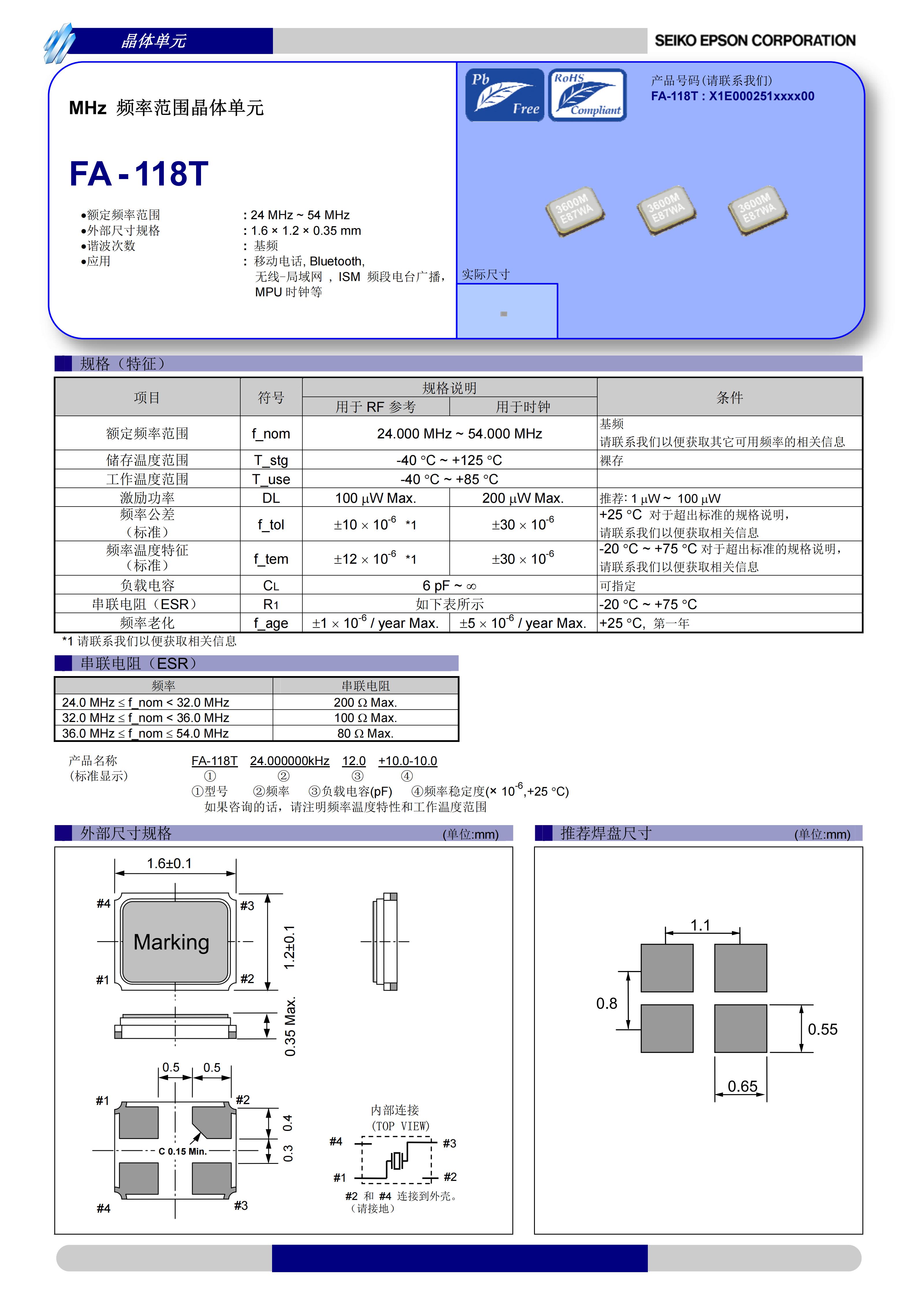 | FA-118T 24.0000 MF10Z-W | FA-118T | 24MHz | 12PF | 10PPM | -20 to +75 °C | 加科电子 |